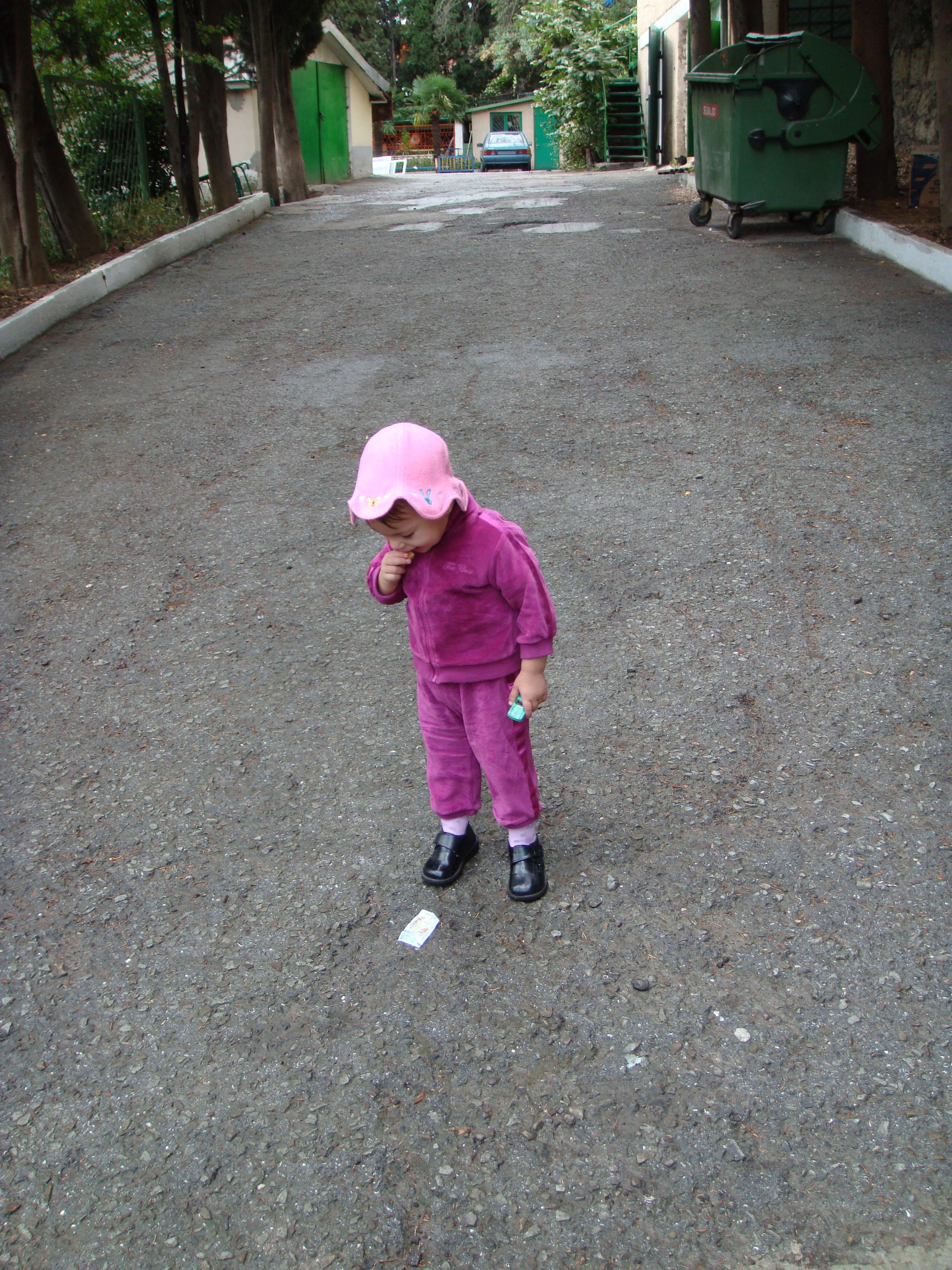 Liliana, when she walks along, gives a little gasp and points at part of a cigarette carton on the ground. I nod; she picks it up. She turns it over with her fingers, then she keeps walking, keeping it clasped tightly in her hand. I think she’s plenty curious.