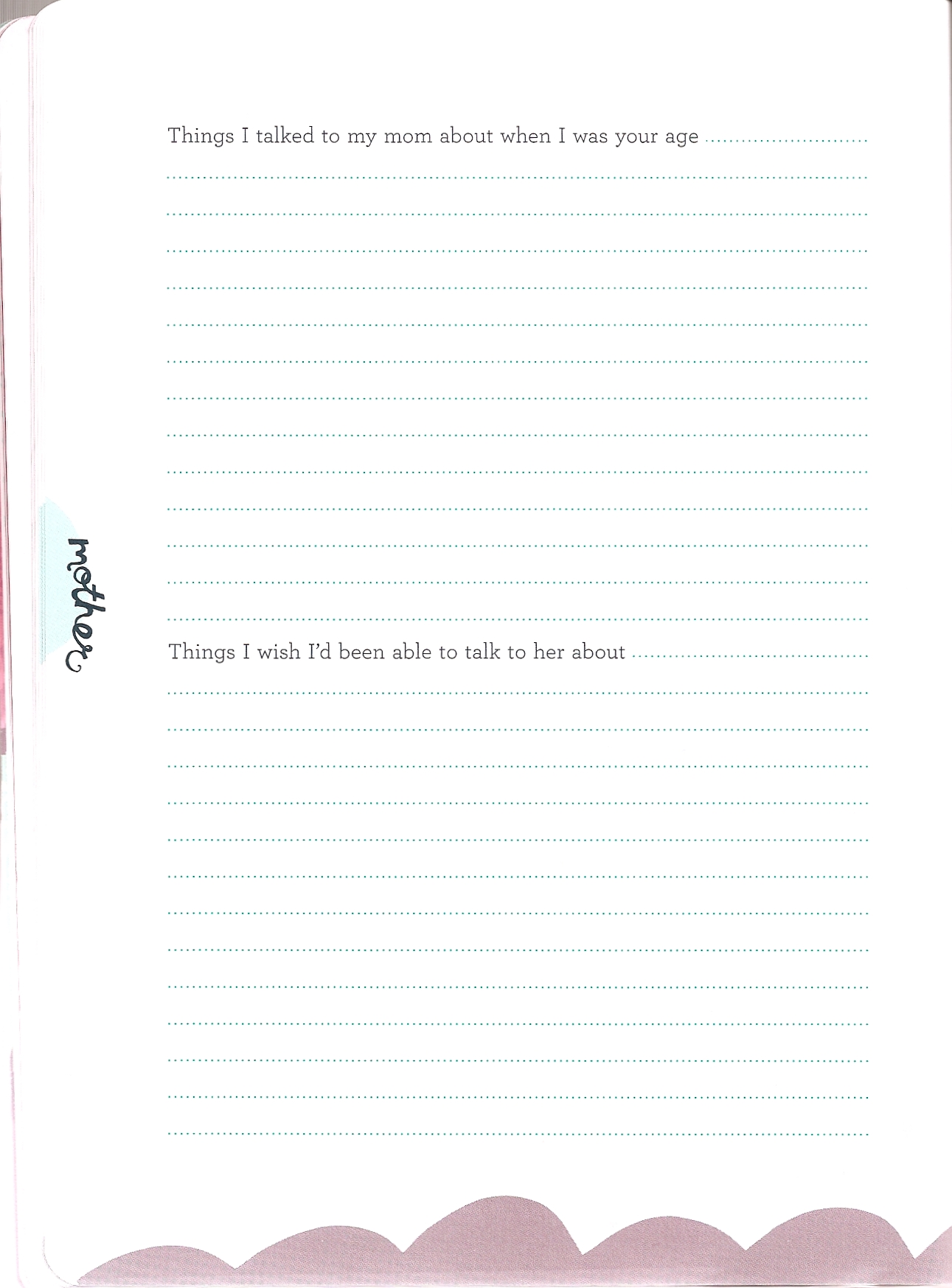 Sample of a mother page (“Things I talked to my mom about when I was your age” and “Things I wish I’d been able to talk to her about”):