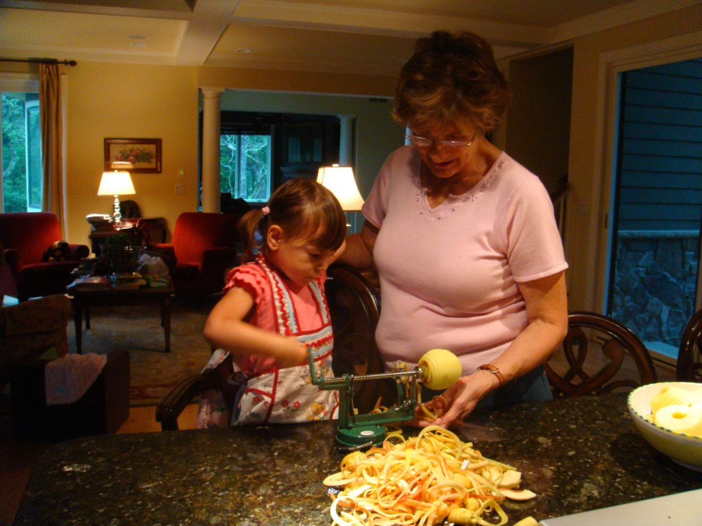 Tonight, we have movie club, so we worked a little on our menu this morning.  Grandma brought the most amazing gadget with her–an apple corer, slicer, and peeler–so I set Liliana and Grandma to work on our Mile-High Apple Pie (recipe here).  Let me tell you, it’s a cinch with that thing!  Look at that girl go!