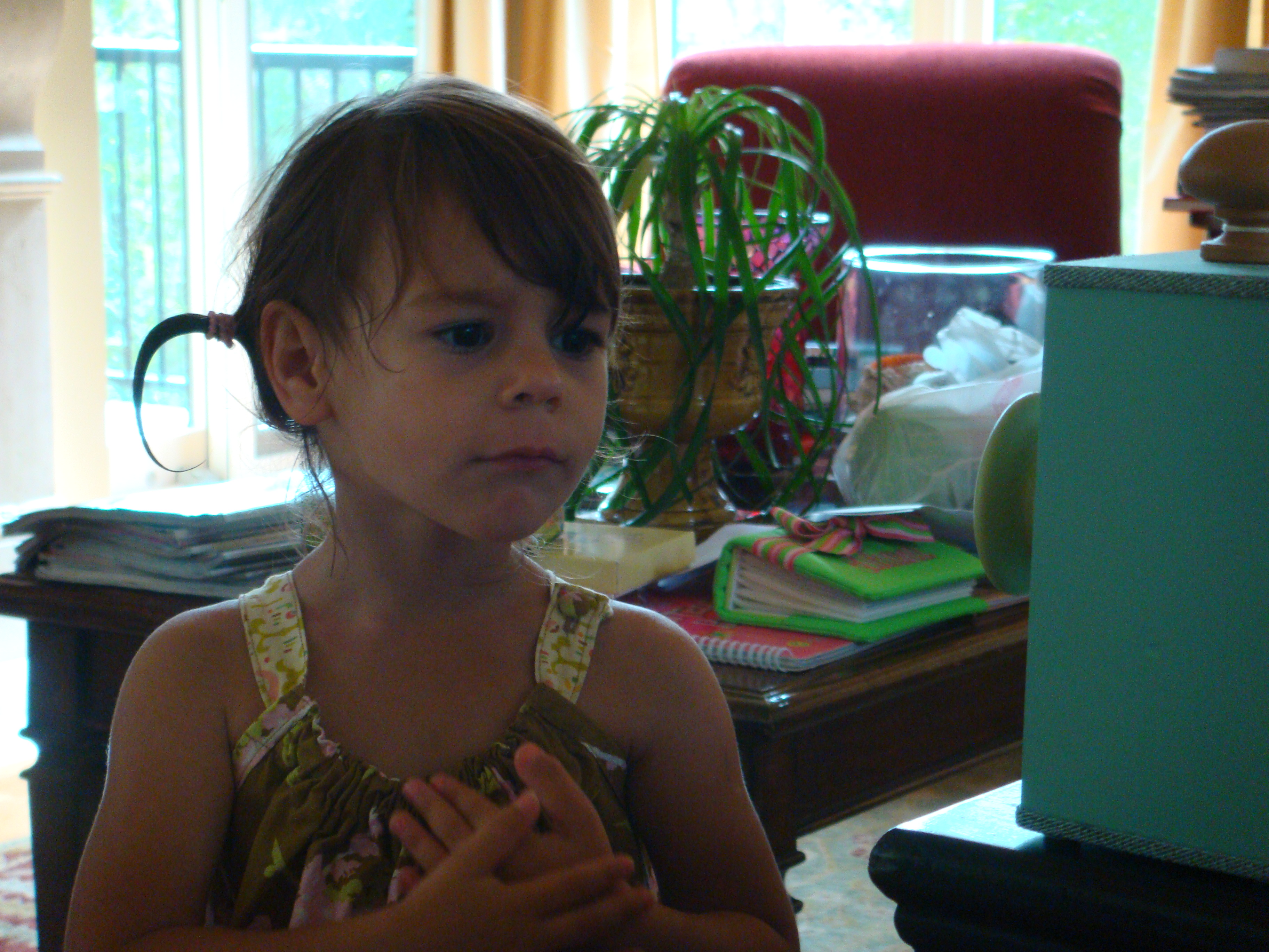 At ATAZ, Grandma bought Liliana a gorgeous music box.  The tune is Hush, Little Baby, the song I sang and hummed to Liliana when we were visiting her in the orphanage–mainly because it was repetitive and recognizable.  Since then, I’ve sung it to her on a number of occasions, and each time, she either wants to snuggle or dance to it.  Her expressions are priceless.  Here she is, after swimming, clasping her chest in heartfelt emotion, as she listens to the tune.