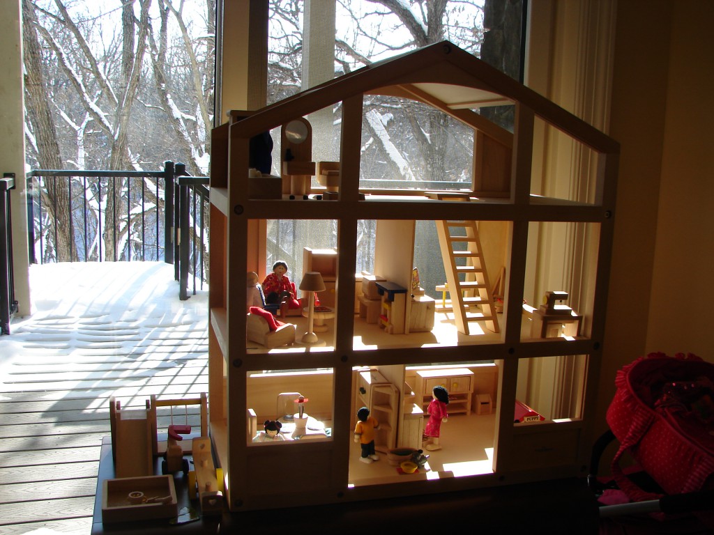 In November, for Liliana’s adoption shower, she was given multiple room sets to a magnificent play house.  Since she’d received so many gifts already, we saved the whole shebang for her one Christmas gift (I know, I know, each room could count as one!), but here it is, in all its glory.  She loves it.  So far it’s been a creative way to teach her words.  Vacuum cleaner.  Vroom!  Washer.  Dryer.  Washing clothes.  Stove.  Hot. Table.  Chairs.  Eat.